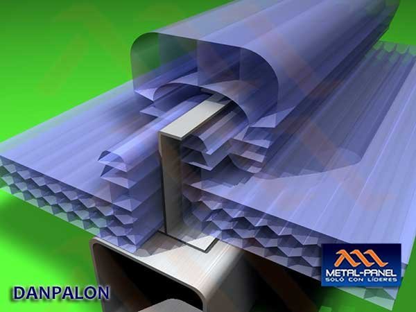 Sistema Danpalon consta de láminas de policarbonato y de una serie de accesorios que complementan la instalación, fijándolo sin perforar la lámina, permitiendo su libre expansión térmica y engargolando los paneles mecánicamente, minimizando el uso de silicones, garantizando 0 filtraciones.